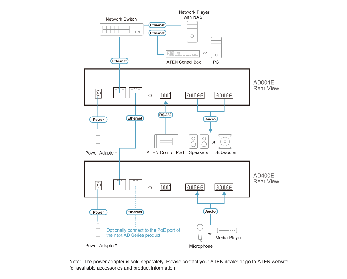 AD400E не только улучшает взаимодействие между устройствами для AoIP (распространение цифрового звука по IP-сети) и выполняет эффективное предусиление. При совместном использовании с продуктами серии профессионального звука компании ATEN, он также реализует распределенную архитектуру DSP, повышая гибкость установки, снижая общую стоимость и расширяя области применения. Он подходит для профессиональных сфер, использующих сетевую технологию Dante, например, конференц-залов различного размера, или мест приема гостей, таких как рестораны и бары.