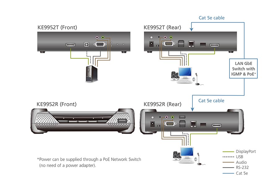 Для устранения необходимости в адаптере питания и эффективного снижения стоимости конфигурации питания, KVM-удлинитель KE9952 оснащен функцией Power over Ethernet (PoE), что позволяет подавать питание от сетевого коммутатора с поддержкой PoE.