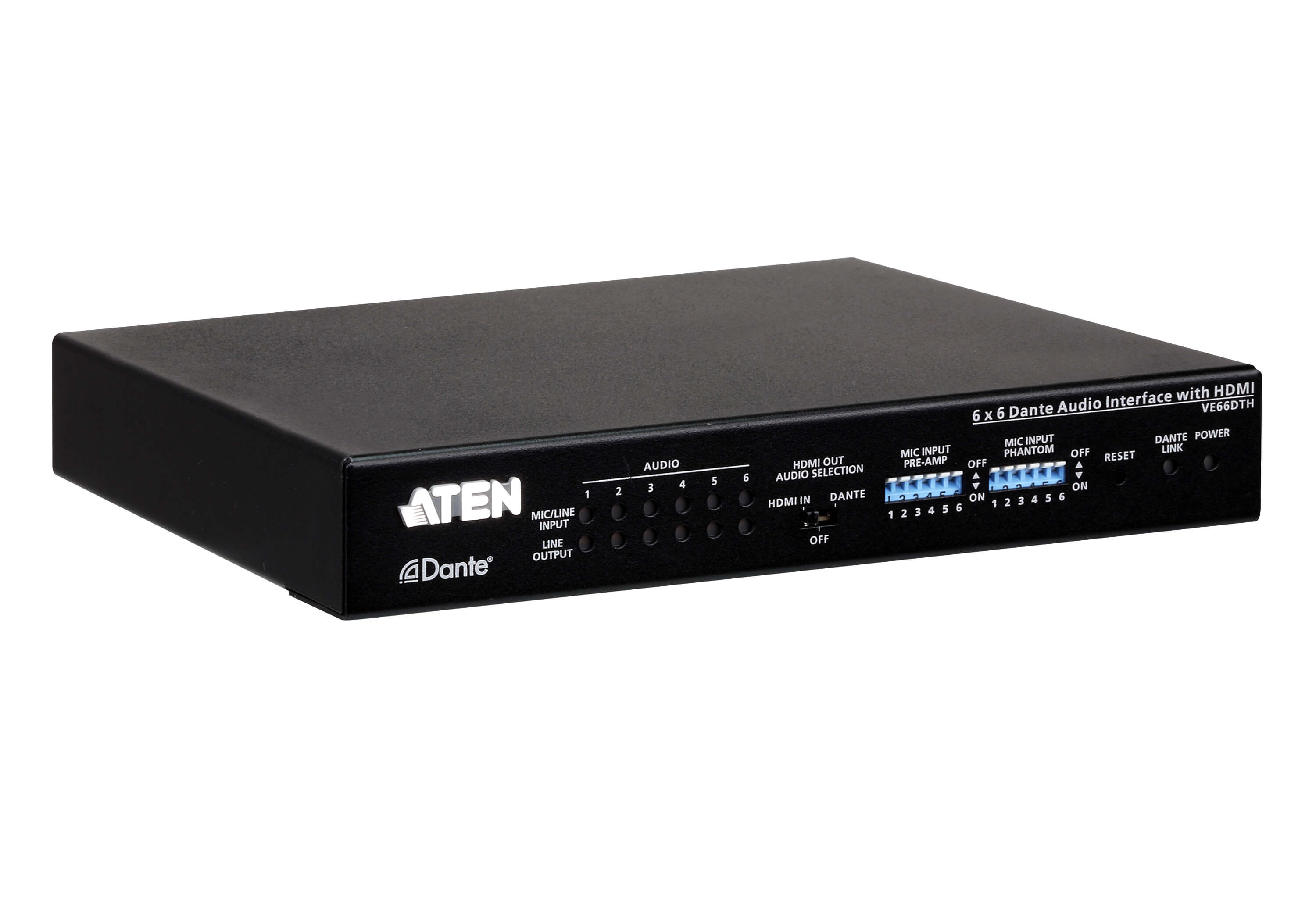 Устройство VE66DTH компании ATEN, это звуковой интерфейс с шестью входами и шестью выходами, использующий транспортную систему Dante (Digital Audio Network Through Ethernet) и оборудованный HDMI. Применение Dante™, как наиболее популярного решения для создания аудиосетей, разработанного компанией Audinate, позволяет устройству VE66DTH передавать через стандартную IP-сеть несжатые цифровые аудиосигналы с практически нулевой задержкой. Устройство VE66DTH через сеть Dante передает и принимает до 6 каналов входа и выхода звука. Входа звука могут одновременно поддерживать различные подключения – как линейный вход, так и динамический, а также конденсаторный микрофоны. Вместе с этим устройство может обеспечить 48В фантомного питания для конденсаторных микрофонов. Благодаря встроенной функции PoE (питание через Ethernet) VE66DTH может быть запитано по Ethernet-кабелю от совместимого PSE-устройства (power sourcing equipment, оборудование-источник питания). Кроме того, устройство VE66DTH предоставляет гибкие возможности по извлечению и встраиванию звука. Оно может извлечь стерео аудиосигналы из HDMI-потока в сетевую систему Dante и встраивать аудиосигналы из Dante-облака в HDMI-вывод.