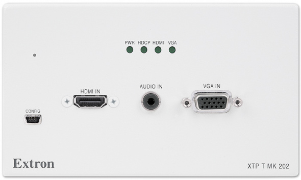 XTP T MK 202 - это компактный передатчик Extron с двумя входами, который передаёт HDMI или VGA-видео, аудио и сигналы управления на расстояния до 100 метров по одному экранированному кабелю CATx. Этот передатчик линейки XTP® совместим со стандартными двухганговыми распределительными коробами типа MK для удобства установки в системах с настенным монтажом. Он поддерживает компьютерные и видеоразрешения до 1920x1200, включая 1080p/60 с Deep Color и 2K. Входящие аналоговые видеосигналы оцифровываются для надёжной передачи, а отдельные потоки аналогового стереоаудио могут быть эмбедированы в выходной сигнал. К функциям устройства также относятся автоматическая коммутация входов с выбором приоритета и вставка двунаправленных сигналов RS‑232 и ИК для возможности управления удалёнными AV‑устройствами. Разработанный для линейки XTP Systems®, XTP T MK 202 может дистанционно получать питание от матричного коммутатора XTP CrossPoint®.