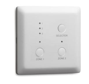 Настенная панель Plena PLE-WP3S2Z-EU используется для удаленного выбора источника музыки, а также для активации или деактивации зон аудиомикшера или микширующего усилителя Plena.