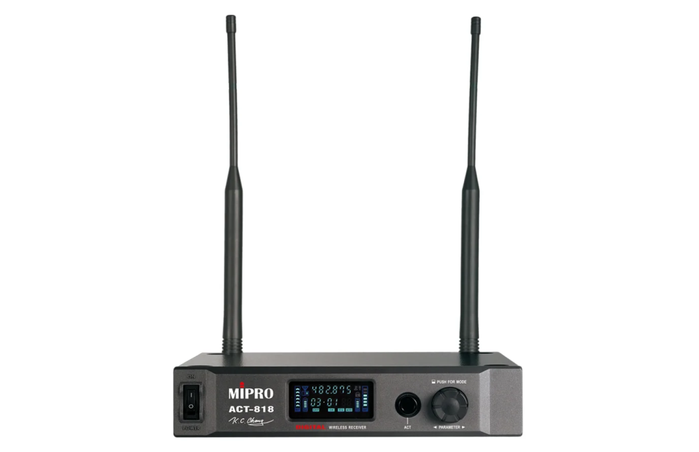 Mipro ACT-818 — одноканальный цифровой приёмник с широкополосным трактом приёма 72 МГц, цифровым разнесением частот и 256-битным шифрованием. Обеспечивает стабильную RF-работу и высокое качество аудио; поддерживает AES/EBU и Wordclock, интегрируется с ПО MWC. Предназначен для профессиональных сценических и инсталляционных задач.