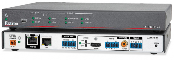 XTP R HD 4K – это приёмник Extron, который обеспечивает передачу видео, аудио, двунаправленных сигналов управления и Ethernet по экранированному кабелю CATx. Этот приёмник совместим с HDCP 2.2 и поддерживает видеоразрешения до 4K. Для упрощения интеграции он обеспечивает возможность пропускать или не пропускать аудио в HDMI и оснащён реле для управления помещениями; приёмник также выполняет деэмбедирование аудио с направлением на цифровой аудиовыход S/PDIF или аналоговый стереовыход. Передача Ethernet и вставка двунаправленных сигналов RS-232 и ИК обеспечивают доступ к LAN и удалённое управление AV-устройствами. Сигналы могут передаваться на расстояние до 100 метров по экранированному кабелю витой пары. XTP R HD 4K поддерживает удалённое питание и идеально подходит для проектов с XTP Systems®, в которых требуется передача сигналов на длинные дистанции к дисплеям и другим выходным устройствам.