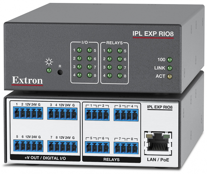 IPL EXP RIO8 – это интерфейс расширения входов/выходов системы управления от Extron, разработанный для простого расширения системы управления с помощью восьми цифровых портов входов/выходов, восьми реле, а также четырёх портов питания 12 В постоянного тока и 24 В DC. Он работает с процессорами управления серии IPCP Pro xi, которые поддерживают безопасную настройку в программе Global Configurator Professional или программирование с помощью Global Scripter®. Эта модель, также как и все интерфейсы расширения входов/выходов от Extron, предлагает удобную возможность передачи питания PoE+ (Power over Ethernet), а также управление, мониторинг и доступ на базе вашей сети. IPL EXP RIO8 разработан в компактном, прочном корпусе «пленум» высотой 1U и шириной в четверть стойки и предлагает различные варианты монтажа