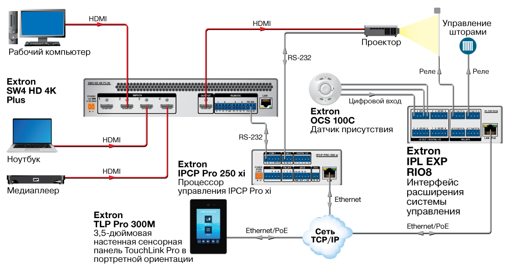 - Эксплуатация, мониторинг и управление AV-оборудованием по стандартной сети Ethernet