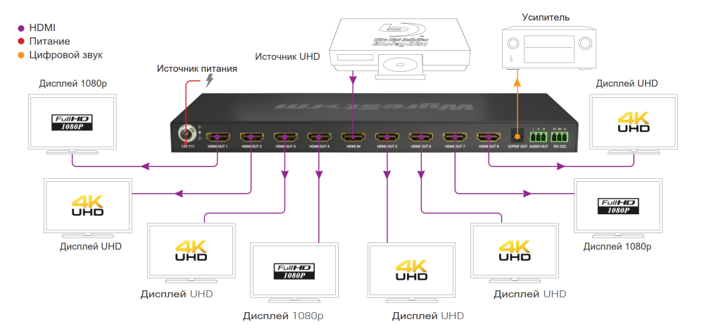 | Выходы | 8 выходов HDMI: 19-контактный, тип A | 1x 3-контактный Phoenix | S/PDIF |