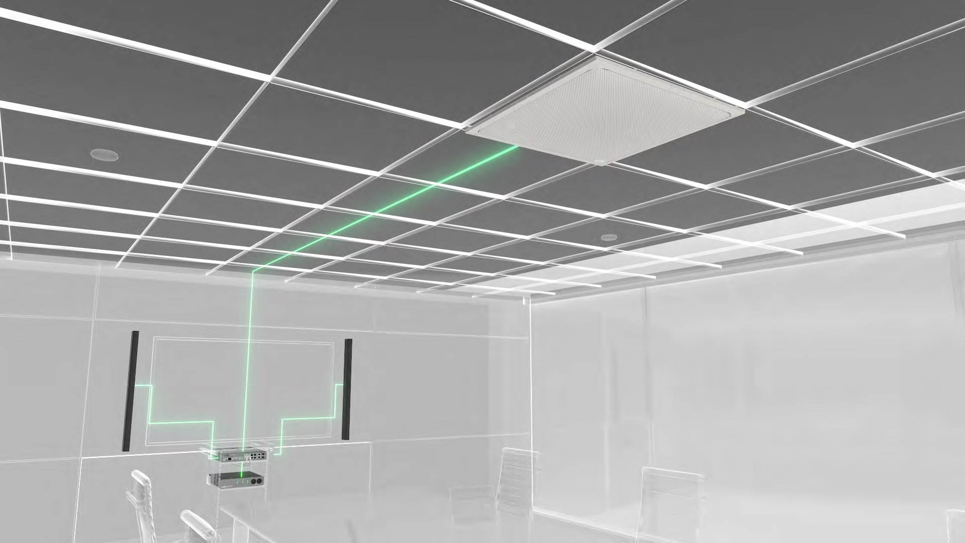В конференц-залах среднего размера, рассчитанных на 10–20 человек, покрытие можно расширить, подключив два потолочных микрофонных массива.