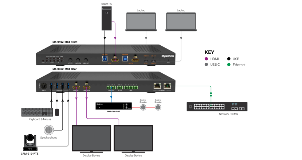 Презентационный коммутатор WyreStorm MX-0402-MST — это идеальное решение для современных переговорных комнат и конференц-залов. Устройство объединяет функции видео, аудио, USB, управления и Ethernet. Благодаря двум входам USB-C и двум входам HDMI, возможностям автоматического переключения и усовершенствованным портам USB 3.2, MX-0402-MST обеспечивает бесподрывное переключение источников и расширенное управление процессом для большинства применений. Кристально чистое видео 4K, высокоскоростная передача данных и эффективная подача питания.