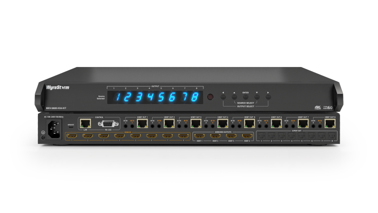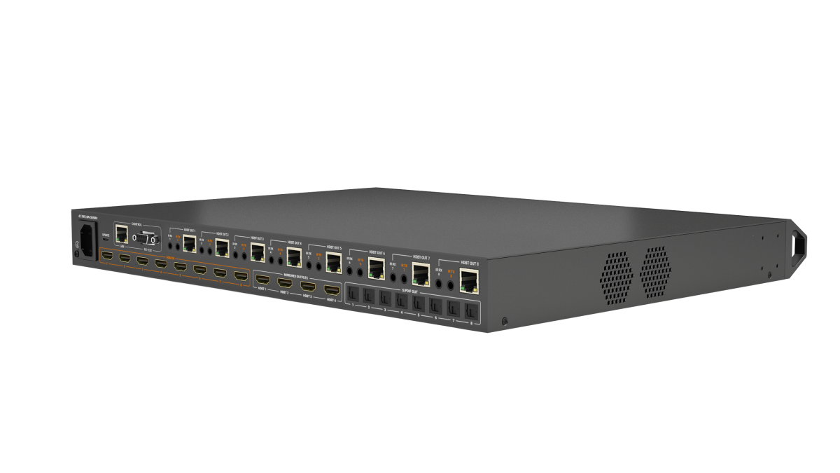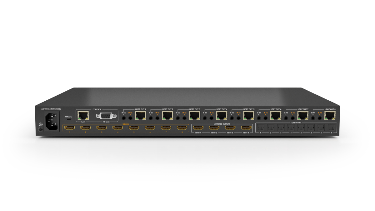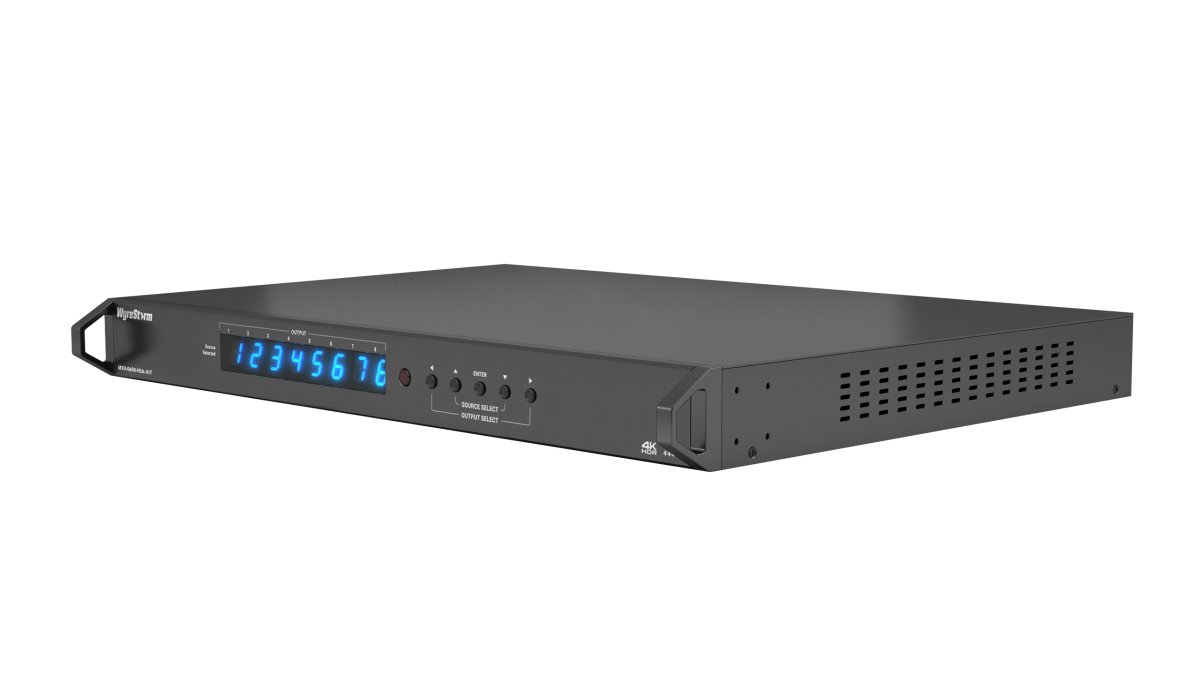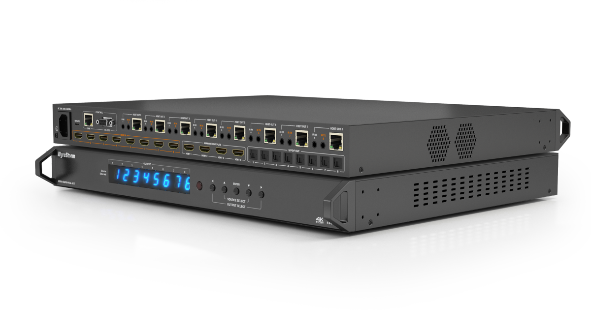 Помимо аудиопортов, MXV 8×8 также оснащен четырьмя зеркальными выходными портами HDMI, которые можно подключить к любому гибридному оптическому HDMI-кабелю HAOC от WyreStorm для передачи сигнала на расстояние до 50 метров или к любому удлинителю для передачи сигнала по оптоволокну HDBaseT или OM3.