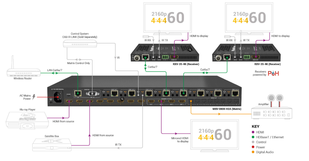 WyreStorm MXV-0808-H2A-KIT — это полнофункциональный комплект на базе матричного коммутатора MXV-0808-H2A, укомплектованный 6 стандартными и 2 масштабирующими приёмниками HDBaseT. Это решение идеально подходит для гибридных инсталляций, где используются дисплеи как 4K, так и 1080p.