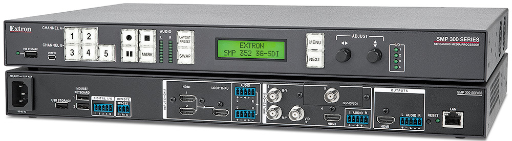 SMP 352 обрабатывает два AV-источника высокого разрешения, поступающие от пяти доступных подключений. Один из двух сигналов HDMI может быть выбран с канала А (Channel A) вместе с аналоговым или эмбедированным в HDMI стереоаудио. Канал А также предлагает локальный выход для HDMI и аудио (loop through), который может напрямую быть подключён к презентационному дисплею. Входы на канале B (Channel B) поддерживают стандартные форматы видеокамер, включая композитное видео, компонентное видео HD, HDMI. Вторая модель, SMP 352 3G‑SDI, принимает последовательные цифровые видеосигналы, поступающие от камер и других видеоисточников профессионального уровня. Входные подключения на каналах A и B поддерживают разрешения компьютерного видео от 640x480 до 1920x1200, а также видеоформаты с разрешениями от 480p до 1080p/60. Каналы могут переключаться в реальном времени во время презентации.