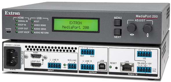 MediaPort 200 от Extron – это шлюз от HDMI к USB для интеграции профессиональных AV‑источников или AV‑систем с программными кодеками конференц-связи. С помощью обычных видео- и аудиодрайверов USB он безупречно функционирует с компьютером. MediaPort® имеет HDMI-вход с локальным выходом «loop-through», совместимым с HDCP, принимает сигналы до 1920x1200 и скалирует видео к выходу USB 2.0. Функции аудио включают входы микрофонного/линейного уровней, деэмбедирование аудио HDMI и двунаправленные сигналы аудио USB, а также выход референсного сигнала AEC и выходы линейного уровня. MediaPort 200 также включает обработку DSP с эквализацией, фильтры, микширование, динамическую обработку и функцию ducking (приглушение при появлении приоритетного сигнала). Таким образом, MediaPort 200 является полноценным интерфейсом для программных кодеков; также есть возможность интеграции в аппаратный кодек или в систему DSP. MediaPort 200 обеспечивает гибкую интеграцию компьютеров для конференц-связи в профессиональные AV‑системы.