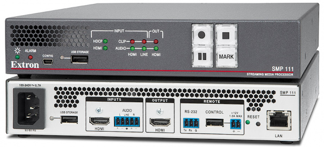Extron SMP 111 – это высокопроизводительный процессор записи и потокового вещания для захвата AV-источников и презентаций и их распределения в виде потоковой трансляции в реальном времени и записанного медиаконтента. SMP 111 поддерживает сигнал HDMI с эмбедированным аудио и аналоговое аудио. Высокопроизводительное скалирование и гибкая обработка сигнала Extron обеспечивают превосходное отображение контента с компьютеров и источников HDTV в разных разрешениях. SMP 111 поддерживает расширенные возможности потокового вещания. Он может одновременно выполнять запись и потоковую передачу в разных разрешениях и с разной скоростью передачи, используя ряд транспортных протоколов и возможностей управления сеансами. Запись с SMP 111 обеспечивает удобный захват прямой трансляции в HDMI и ее сохранение во внутренней флеш-памяти и на внешних USB-накопителях. Не требуя лицензионных взносов, SMP 111 является экономичным решением для потоковой трансляции и записи контента.