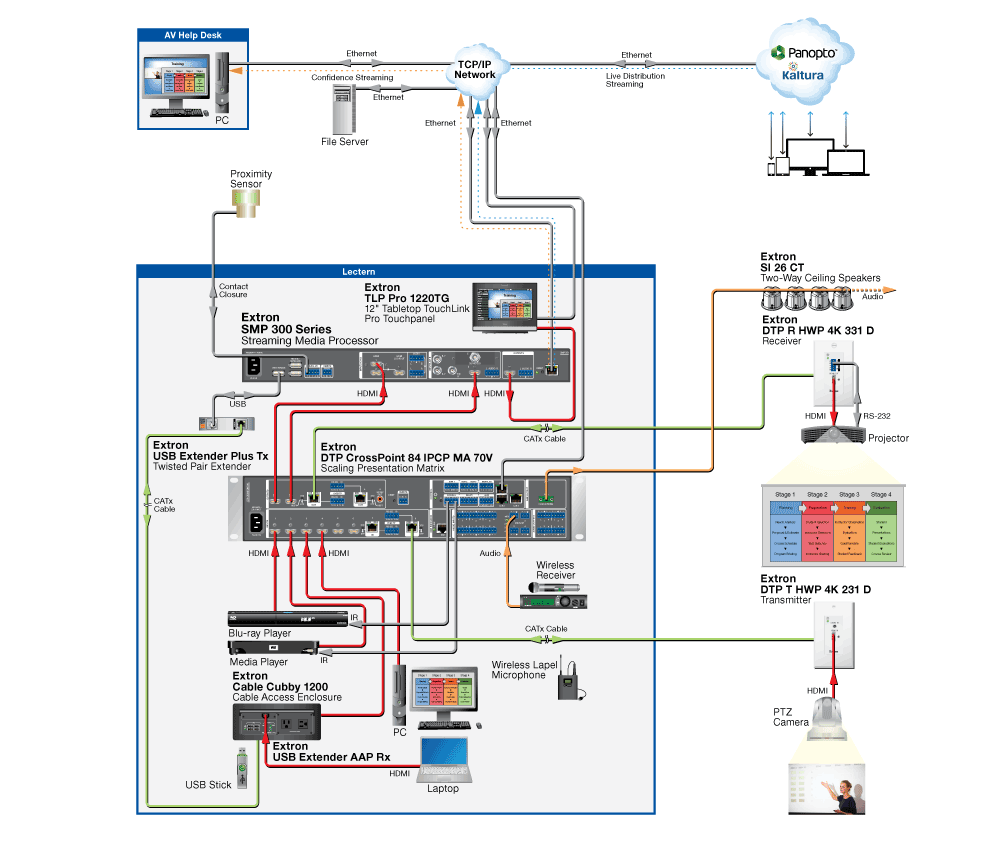 - Лёгкость настройки и эксплуатации с передней панели или с внешней системы управления — гарантирует потоковую передачу и запись презентаций, а также документирование и повторное использование ценной информации для других целей.