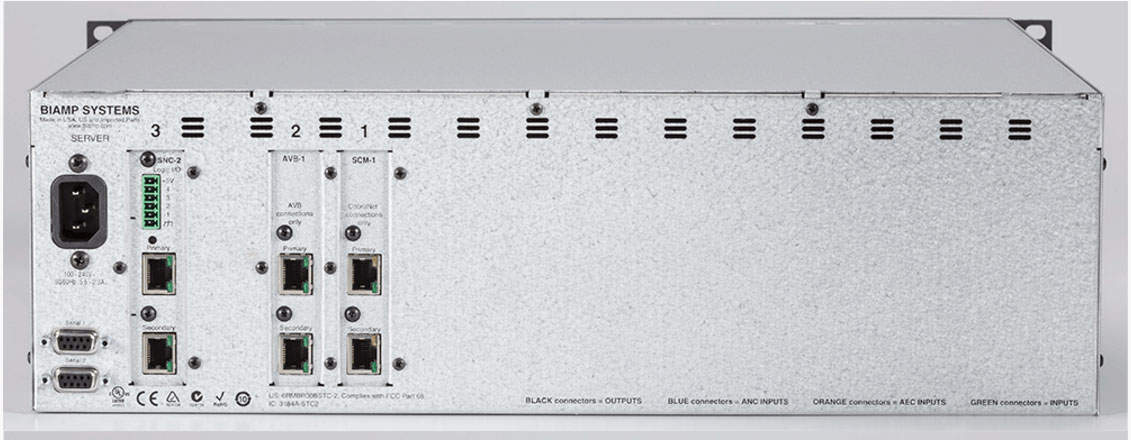Tesira SERVER производства Biamp — цифровой сетевой сервер. Этот сервер является “сердцем” системы Tesira. Данный сервер поставляется с одной картой DSP-2, опционально может быть установлено до 8 таких карт. Также сервер укомплектован одной картой AVB-1 (420 х 420 каналов AVB) и, на выбор, дополнительной картой AVB-1, картой SCM-1 (32 х 32 канала CobraNet), картой DAN-1 (64 x 64 канала Dante) или стандартной картой входов/выходов.