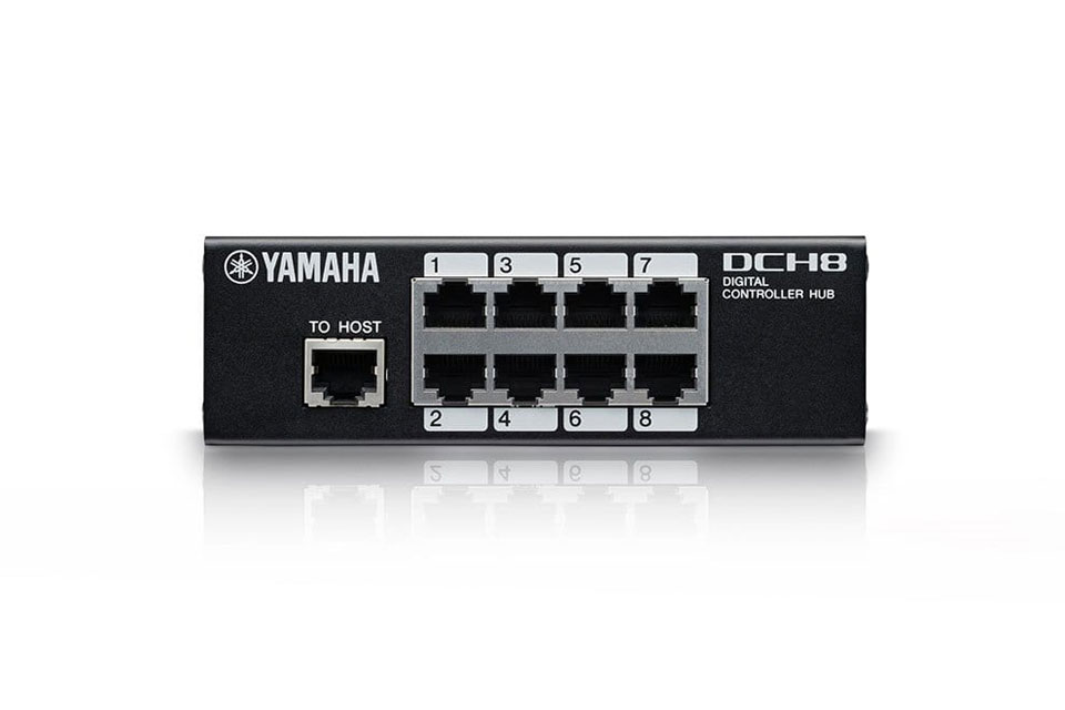Yamaha DCH8 - коммутатор, выполняющий функции ретранслятора между главным устройством (MTX3, MTX5-D, MRX7-D, MA2120, PA2120) и панелями управления серии DCP, позволяя комбинировать в сети звездообразные и последовательные соединения. Питание подводится от главного устройства по кабелю CAT5, что упрощает кабельную разводку и даёт свободу размещения устройств. Расстояние между хостом и самой дальней панелью управления не должно превышать 200 метров. Для гибкости установки предусмотрены монтажные отверстия на задней и боковых панелях. Винты для установки в аппаратную стойку в комплект не входят.
