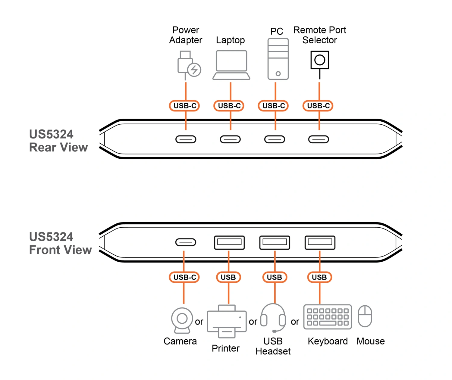 Коммутатор ATEN US5324 одним нажатием кнопки или с помощью пульта удаленного переключения порта позволяет совместно использовать 4 периферийных USB-устройства между одним компьютером с портом USB тип A и одним компьютером с портом USB тип C со сверхвысокой скоростью 5 Гбит/с.