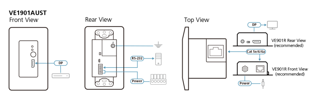 - 1x передатчик VE1901AUST DisplayPort HDBaseT-Lite с монтажной панелью US и функцией PoH