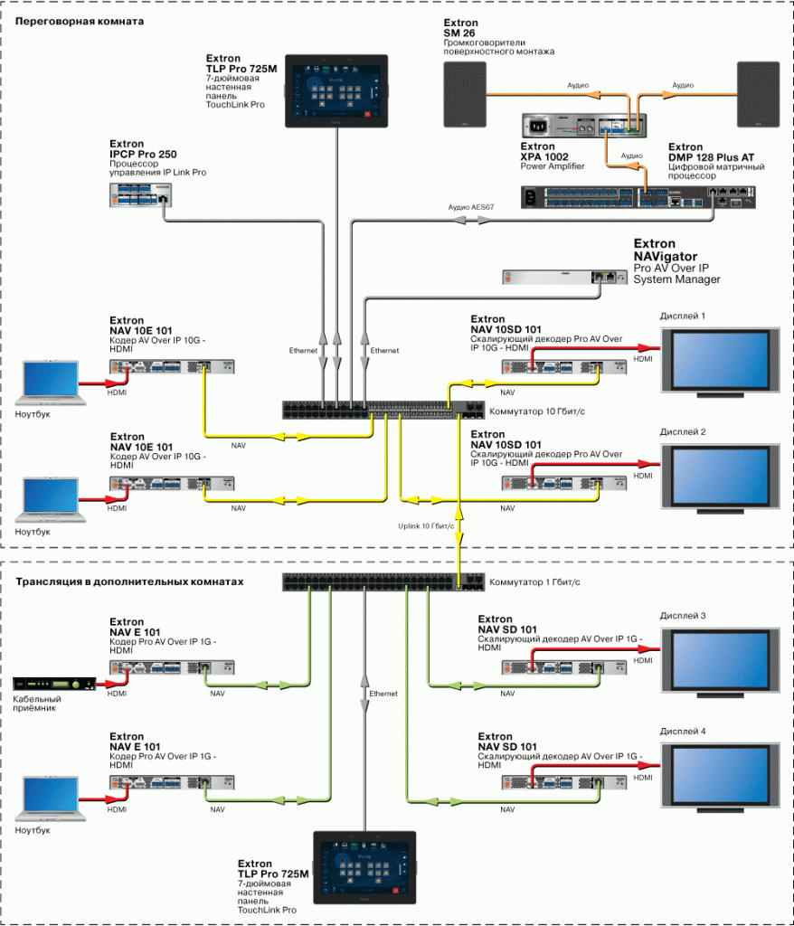 Системы NAV не ограничены только передачей и распределением видеосигналов. Множество кодеров и декодеров можно использовать вместе для создания AV‑матрицы на базе IP‑сети. Устройства линейки NAV Pro AV over IP предлагают гибкие возможности IP‑системы наряду с такими же удобными для интегратора функциями коммутации видео- и аудиосигналов, как на стандартных матричных коммутаторах, в частности, Key Minder, EDID Minder®, USB и независимая коммутация аудио. Вы можете создать небольшую систему коммутации на базе IP с использованием нескольких кодеров и декодеров, а также систему управления Extron серии Pro для безопасной коммутации. В проектах более крупного масштаба NAVigator System Manager может расширить функционал матричной коммутации, предлагая улучшенное управление и мониторинг системы в масштабе всей организации.