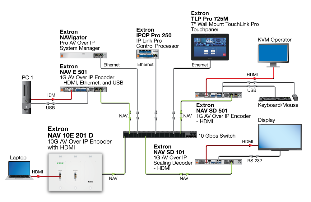 Системы NAV не ограничены только передачей и распределением видеосигналов. Множество кодеров и декодеров можно использовать вместе для создания AV‑матрицы на базе IP‑сети. Устройства линейки NAV Pro AV over IP предлагают гибкие возможности IP‑системы наряду с такими же удобными для интегратора функциями коммутации видео- и аудиосигналов, как на стандартных матричных коммутаторах, в частности, Key Minder, EDID Minder®, USB и независимая коммутация аудио. Вы можете создать небольшую систему коммутации на базе IP с использованием нескольких кодеров и декодеров, а также систему управления Extron серии Pro для защищённой коммутации. В проектах более крупного масштаба NAVigator System Manager может расширить функционал матричной коммутации, предлагая улучшенное управление и мониторинг системы в масштабе всей организации.