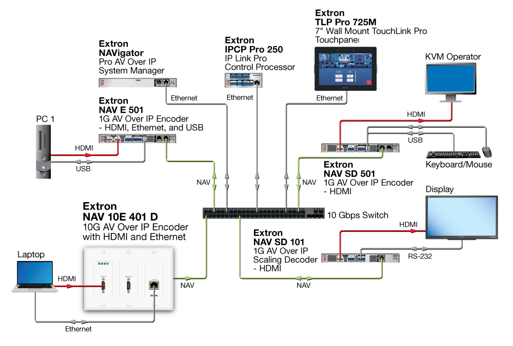 Системы NAV не ограничены только передачей и распределением видеосигналов. Множество кодеров и декодеров можно использовать вместе для создания AV‑матрицы на базе IP‑сети. Устройства линейки NAV Pro AV over IP предлагают гибкие возможности IP‑системы наряду с такими же удобными для интегратора функциями коммутации видео- и аудиосигналов, как на стандартных матричных коммутаторах, в частности, Key Minder, EDID Minder®, USB и независимая коммутация аудио. Вы можете создать небольшую систему коммутации на базе IP с использованием нескольких кодеров и декодеров, а также систему управления Extron серии Pro для защищённой коммутации. В проектах более крупного масштаба NAVigator System Manager может расширить функционал матричной коммутации, предлагая улучшенное управление и мониторинг системы в масштабе всей организации.