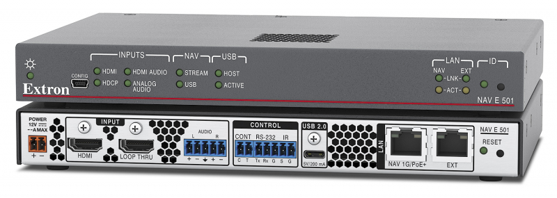 Extron NAV E 501 – это кодер с технологией Pro AV over IP, который передаёт видео, аудио, Ethernet и сигналы USB 2.0 высокого качества с очень низкой задержкой по сетям Ethernet 1 Гбит/с при низких скоростях. Используя запатентованный Extron кодек PURE3®, он обеспечивает передовую производительность за счёт передачи видео высокого качества с разрешениями до 4K при 60 Гц и семплированием цвета 4:4:4 с очень низкой задержкой. NAV E 501 полностью совместим с конечными устройствами NAV® 10 Гбит/с, обеспечивая возможность расширения в больших инсталляциях. Поддержка аналогового аудио, эмбедированного в HDMI цифрового аудио и стандарта AES67 для передачи аудио по IP‑сетям предоставляет гибкие возможности интеграции с аудиопроцессорами DMP Plus или другими аудиоустройствами с IP‑интерфейсом. Разработанная с целью поддержки профессиональных AV‑систем с высокими требованиями, мощная платформа NAV с возможностью расширения обеспечивает защищённую трансляцию AV‑сигналов к тысячам кодеров и декодеров.