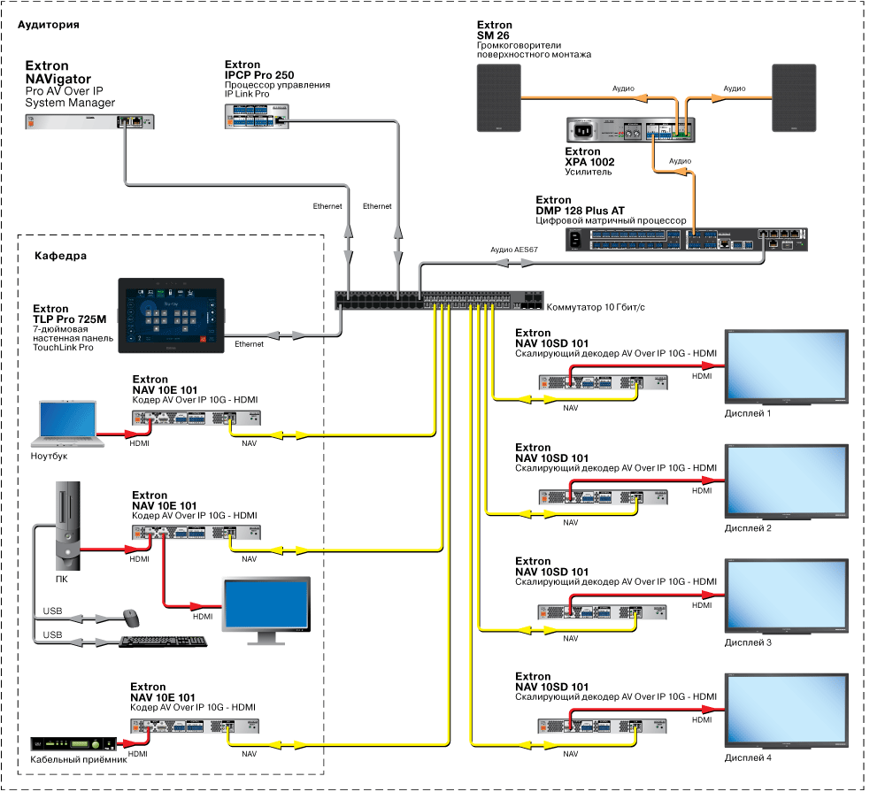 Системы NAV не ограничены только передачей и распределением видеосигналов. Множество кодеров и декодеров можно использовать вместе для создания AV‑матрицы на базе IP‑сети. Устройства линейки NAV Pro AV over IP предлагают гибкие возможности IP‑системы наряду с такими же удобными для интегратора функциями коммутации видео- и аудиосигналов, как на стандартных матричных коммутаторах, в частности, Key Minder®, EDID Minder®, независимая коммутация USB и аудио. Вы можете создать небольшую систему коммутации на базе IP с использованием нескольких кодеров и декодеров, а также систему управления Extron серии Pro для защищённой коммутации. В проектах более крупного масштаба NAVigator System Manager может расширить функционал матричной коммутации, предлагая улучшенное управление и мониторинг системы в масштабе всей организации.