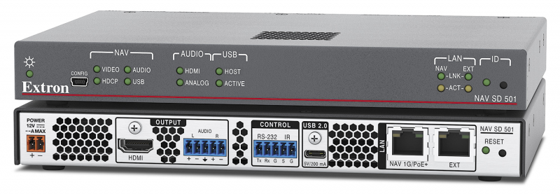 Extron NAV SD 501 – это скалирующий декодер с технологией Pro AV over IP, который декодирует и скалирует видео, аудио, Ethernet и сигналы USB 2.0 высокого качества с очень низкой задержкой для передачи по сетям Ethernet 1 Гбит/с при низких скоростях. Используя запатентованный Extron кодек PURE3®, он обеспечивает передовую производительность за счёт передачи видео высокого качества с разрешениями до 4K при 60 Гц и семплированием цвета 4:4:4 с очень низкой задержкой. NAV SD 501 полностью совместим с конечными устройствами NAV® 10 Гбит/с, обеспечивая возможность расширения в больших инсталляциях. Кроме этого, он поддерживает стандарт AES67 для передачи аудио по технологии Audio over IP, тем самым обеспечивая гибкую интеграцию с аудиопроцессорами DMP Plus или другими аудиоустройствами с IP‑интерфейсом. Разработанная с целью поддержки профессиональных AV‑систем с высокими требованиями, мощная платформа NAV с возможностью расширения обеспечивает защищённую трансляцию AV‑сигналов к тысячам кодеров и декодеров.