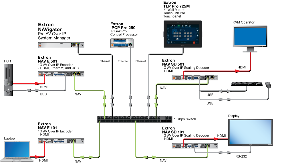 Системы NAV не ограничены только передачей и распределением видеосигналов. Множество кодеров и декодеров можно использовать вместе для создания AV‑матрицы на базе IP‑сети. Устройства линейки NAV Pro AV over IP предлагают гибкие возможности IP‑системы наряду с такими же удобными для интегратора функциями коммутации видео- и аудиосигналов, как на стандартных матричных коммутаторах, в частности, Key Minder, EDID Minder®, USB и независимая коммутация аудио. Вы можете создать небольшую систему коммутации на базе IP с использованием нескольких кодеров и декодеров, а также систему управления Extron серии Pro для безопасной коммутации. В проектах более крупного масштаба NAVigator System Manager может расширить функционал матричной коммутации, предлагая улучшенное управление и мониторинг системы в масштабе всей организации.
