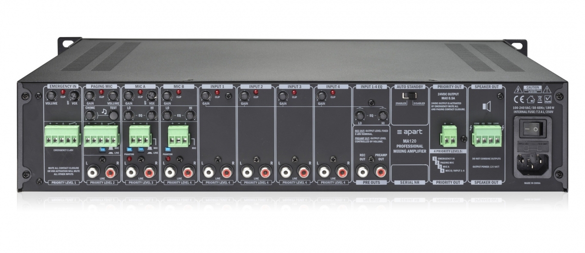APART MA-120 традиционно оборудован выходом «REC OUT», и выходом «PREAMP OUT», организованными на разъемах RCA, для подачи сигналов с микширующей секции на запись и на дополнительный усилитель мощности соответственно. Все без исключения входы микшера MA-120 - снабжены индикаторами перегрузки, и это очень удобно, поскольку при настройке системы очень важно контролировать уровни сигналов и не перегрузить входы - чтобы система не усиливала искаженный сигнал.