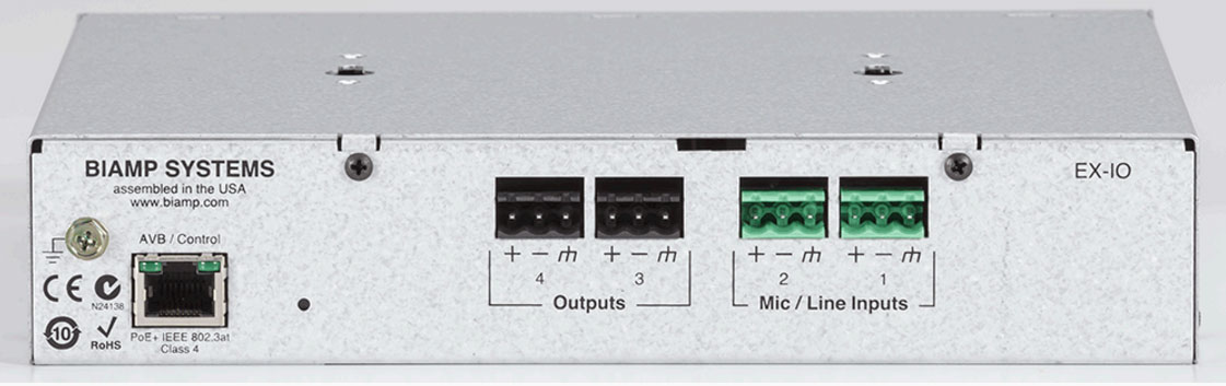 Tesira EX-IO — модуль расширения системы Tesira, используемый с Tesira SERVER, SERVER-IO и TesiraFORTÉ (только модели с AVB). EX-IO добавляет в систему 2 входа и 2 выхода с микрофонным/ линейным уровнем сигнала. Настройка устройства и управление им осуществляется по сети Ethernet с поддержкой AVB. Питание PoE+.