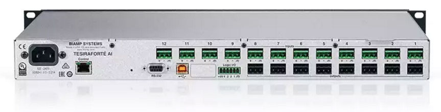 TesiraFORTE AI — это DSP-аудиоплатформа класса серверов с 12 аналоговыми входами и 8 аналоговыми выходами, которая имеет до 8 настраиваемых каналов для передачи звука по USB. TesiraFORTE может напрямую взаимодействовать с другими устройствами через порт USB, а также использовать все преимущества самых современных решений для проведения конференций.