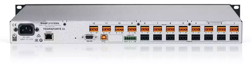TesiraFORTE CI — это DSP-аудиоплатформа класса серверов с 12 аналоговыми входами и 8 аналоговыми выходами, которая оснащена технологией эхоподавления (AEC) Sona™ на всех 12 входах. Также имеет до 8 настраиваемых каналов для передачи звука по USB. TesiraFORTE может напрямую взаимодействовать с другими устройствами через порт USB, а также использовать все преимущества самых современных решений для проведения конференций.