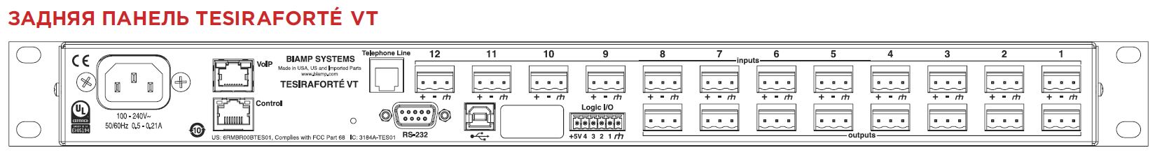 TesiraFORTÉ VT – это DSP-аудиоплатформа класса серверов с 12 аналоговыми входами и 8 аналоговыми выходами, которая оснащена технологией акустического эхоподавления (AEC) на всех 12 входах. Также имеет до 8 настраиваемых каналов для передачи звука по USB, 2-канальный интерфейс для IP-телефонии и стандартный телефонный интерфейс FXO. TesiraFORTE может напрямую взаимодействовать с устройствами через порт USB, использовать все преимущества самых современных решений для проведения конференций. TesiraFORTE VT предлагает широкие возможности обработки звука, среди которых: технология эхоподавления AEC, маршрутизация и микширование сигналов, эквалайзер, фильтры, динамическая обработка, задержка, а также инструменты управления, мониторинга и диагностики. Все функции настраиваются через ПО конфигурирования Tesira. TesiraFORTE VT наилучшим образом подходит для помещений, в которых требуется качественное усиление голоса, а также поддержка IP-телефонии, функции «микс-минус», поднятия голоса и эхоподавления.