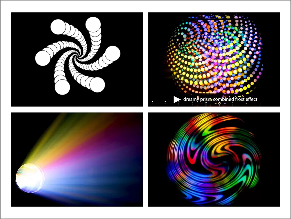 | Колесо эффектов | - 7 цветов, может использоваться отдельно или в комбинации с призмой - вращается в двух направлениях с возможностью регулировки скорости вращения. - Доступны эффекты калейдоскопа и радуги. |