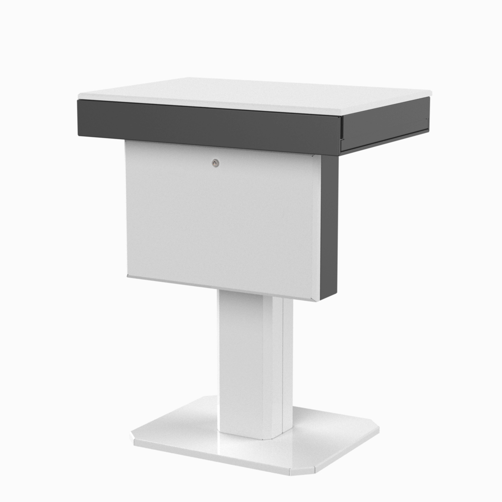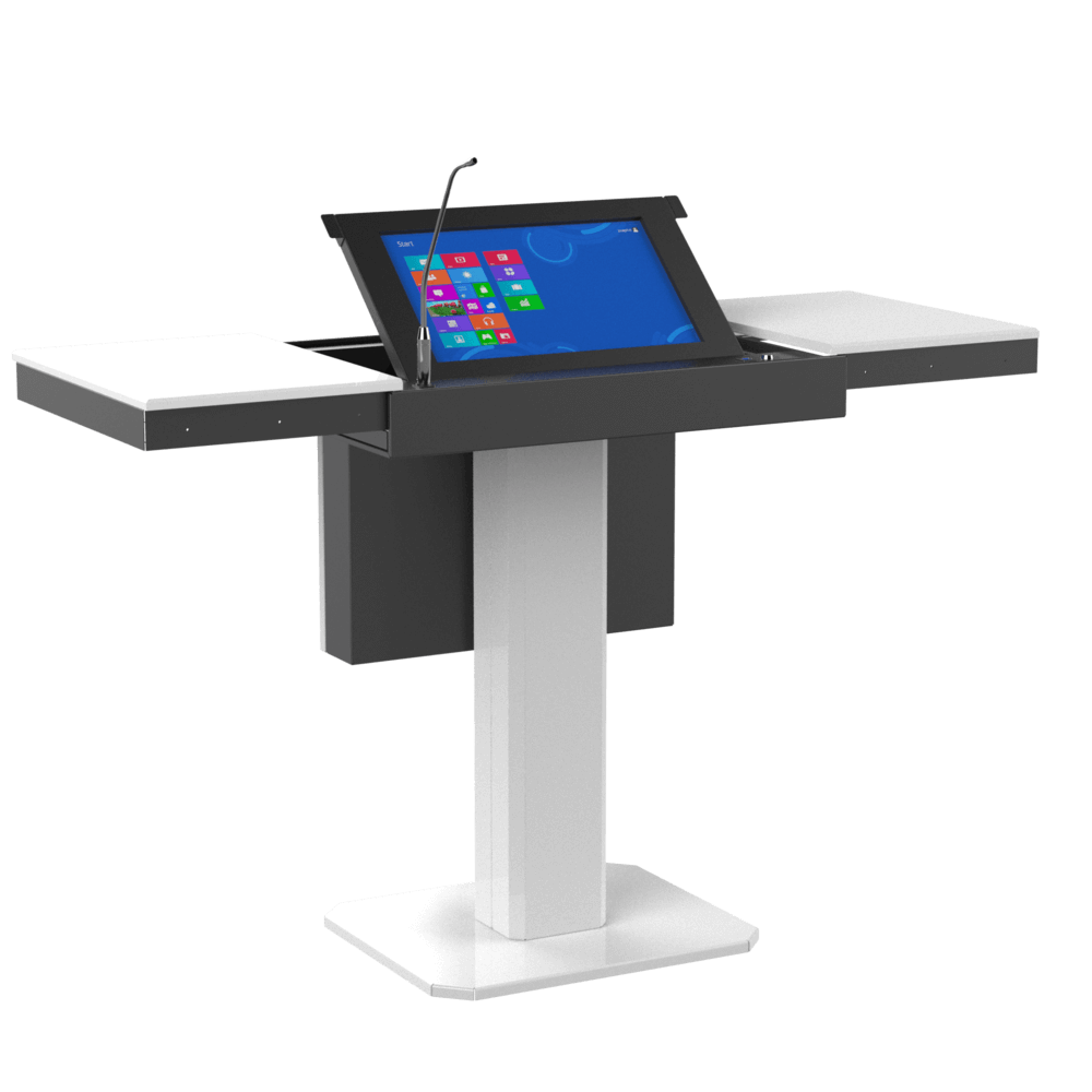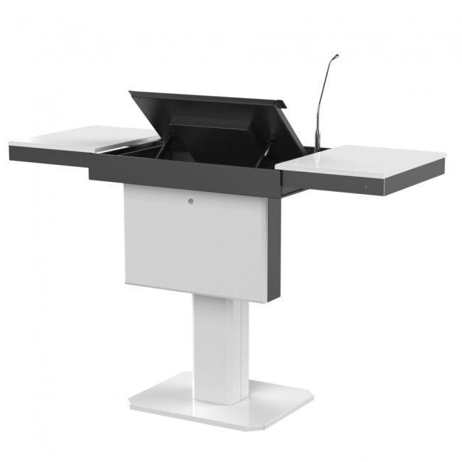 Основные преимущества: возможность увеличения рабочего пространства, легкость в подключении, простота эксплуатации за счёт конструкции. При необходимости мультимедийную трибуну можно наделить функцией регулировки высоты.