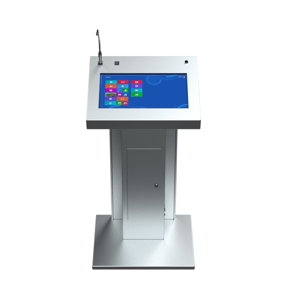 AV-Jota-tribune - это минимализм исполнения, подчёркивающий эстетический вид мультимедийной интерактивной трибуны — основное преимущество этой модели. Изделие стандартно изготавливается из стали.