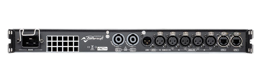 - с передней панели: дисплей отображает доступный запас по мощности (headroom) и статус системы, а органы управления позволяют вызывать пресеты (в том числе поканально), регулировать усиление, задержку и отключать звук, что делает усилитель идеальным решением для прокатных компаний;