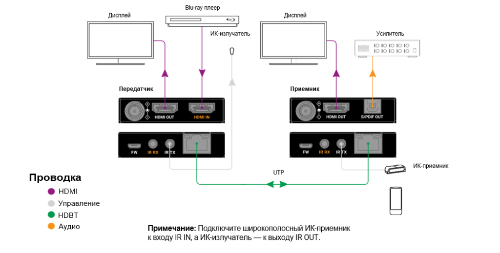 Удлиняет сигналы HDMI и ИК на расстояние до 70 метров по одному кабелю Cat6/6a или до 50 метров по кабелю Cat5e.