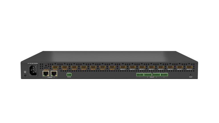 - Включает 4 аналоговых аудиовыхода, обеспечивающих распределение аудио на системы звукоусиления