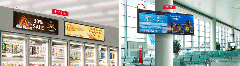 При установке на высоте дисплей BH7N поддерживает наклон до 30°, что способствует улучшению восприятия изображения и повышению удобства просмотра для пользователей.