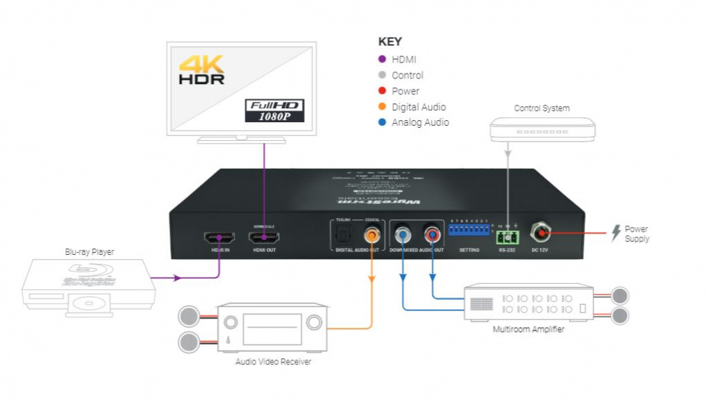 С учетом максимальной совместимости выход HDMI EXP-CON-H2-DD оснащен мощным скейлером. Легко подключите источник 4K HDR и масштабируйте до 1080p при подключении к более старому дисплею.