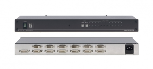 Kramer VM-12HDCP - высококачественный усилитель-распределитель сигнала DVI-D. Он выполняет перетактирование сигнала и компенсацию АЧХ кабеля, после чего выдает сигнал на 12 одинаковых выходов.