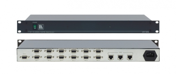 Kramer VP-12NHD — высококачественный усилитель-распределитель 1:12 для компьютерного графического сигнала. Он, после буферизации и развязки, распределяет сигнал с единственного входа на 12 идентичных выходов с 15-контактными разъемами HD