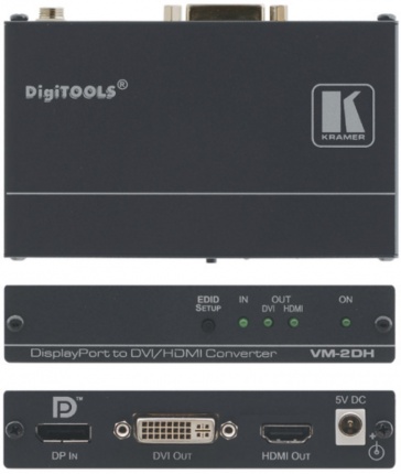 VM-2DH — совместимый с HDCP преобразователь сигнала DisplayPort в DVI и HDMI с усилителем-распределителем.