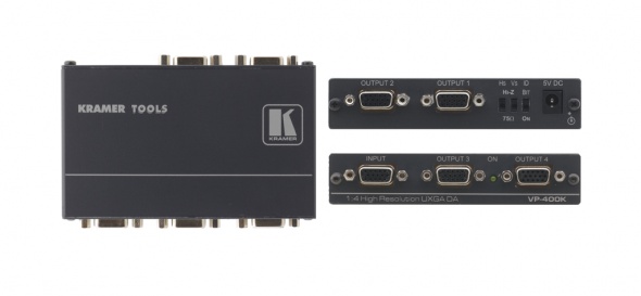 VP-400K — высококачественный усилитель-распределитель для компьютерных графических сигналов UXGA и более высоких разрешений. Прибор имеет один вход, сигнал с которого после буферизации и развязки распределяется на четыре идентичных выхода