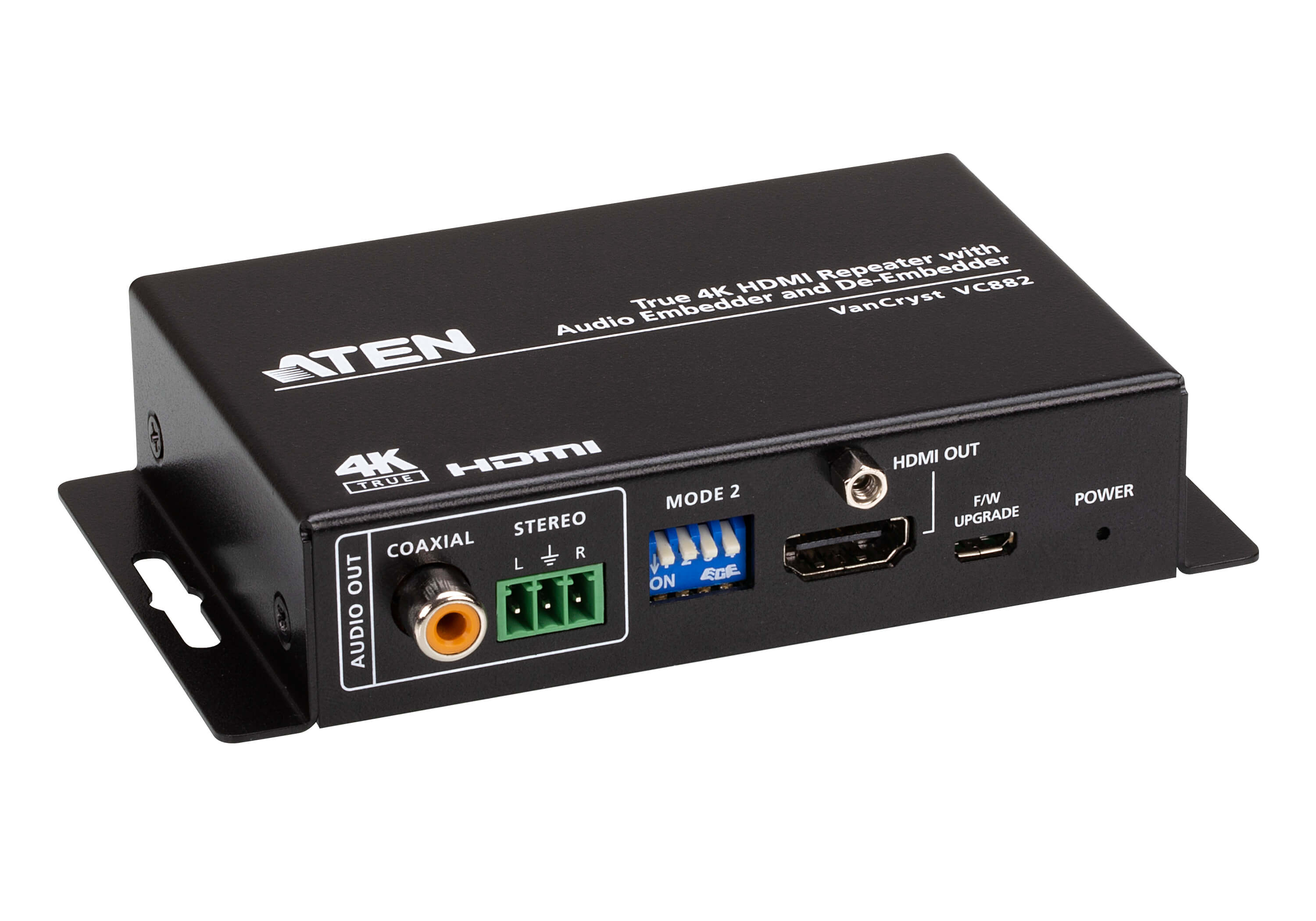 Устройство VC882 компании ATEN, это повторитель True 4K HDMI-сигнала, способный встраивать звуковой сигнал в HDMI-поток или извлекать из него, при этом поддерживая передачу HDMI-сигнала с разрешением True 4K на расстояние до 5 метров. Помимо встраивания отдельного звука в исходящий HDMI-поток, повторитель VC882 также позволяет извлекать звук из HDMI-поток и выводить извлеченный звуковой сигнал через альтернативную аудиосистему.