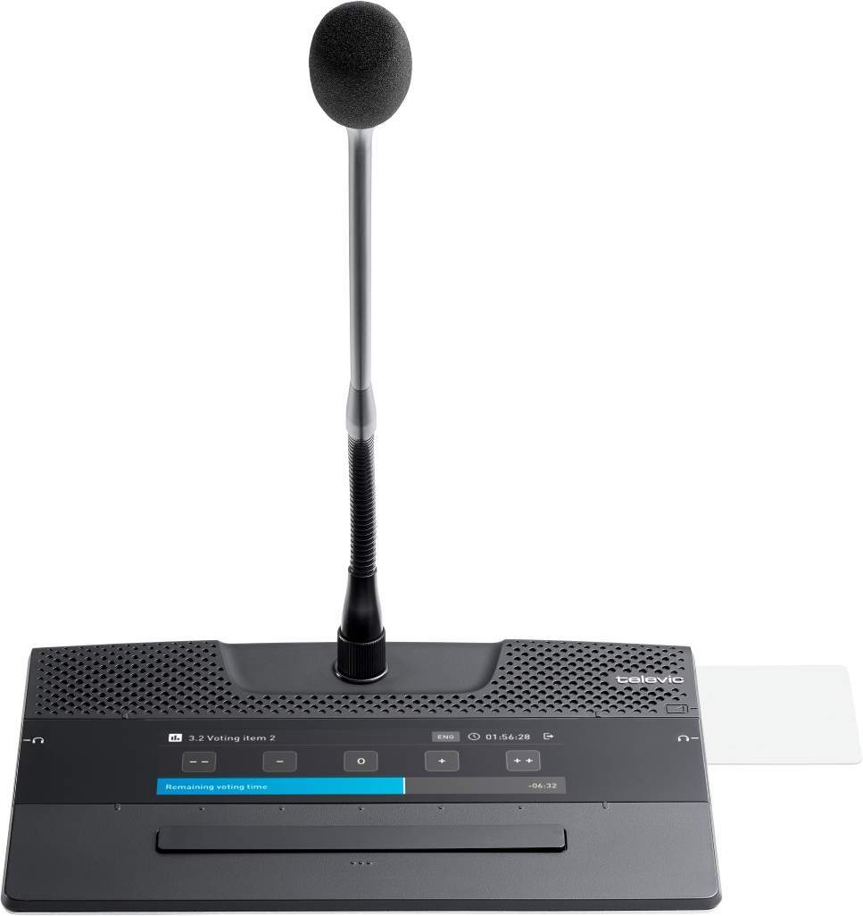 - Интерактивный дисплей, показывающий информацию о собрании: тема повестки дня, кто выступает, позиция в списке запросов, таймеры выступлений, голосование и выбор языка в зависимости от активированных лицензий