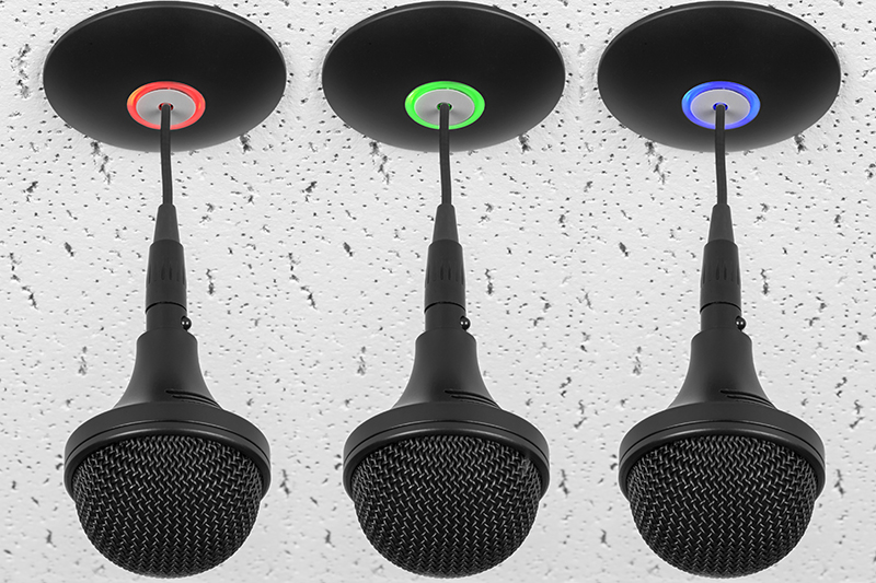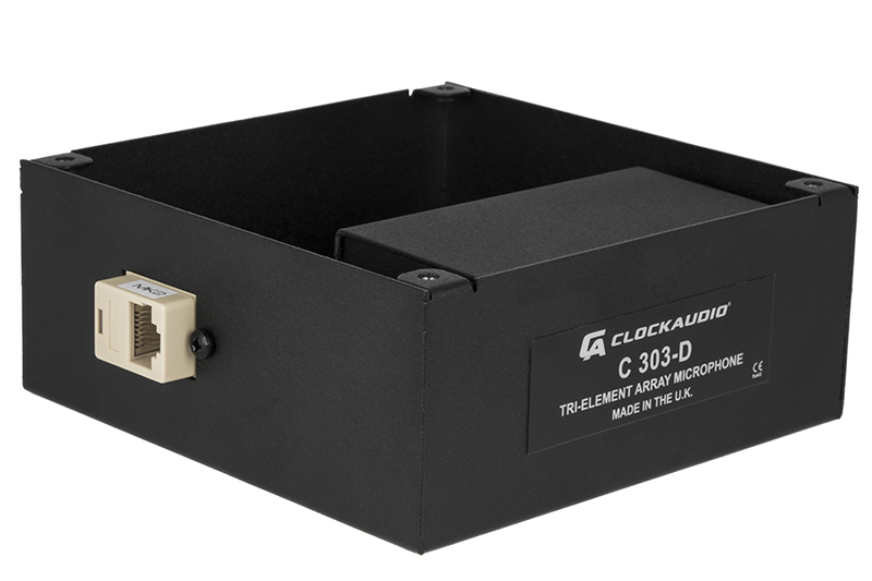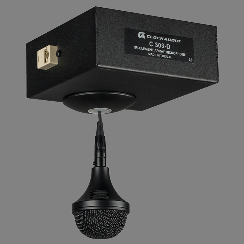 Clockaudio C 303-D – это трехэлементный микрофонный массив с поддержкой Dante, AES67 и питанием по POE. Модель C 303-D также получила возможность управлять программируемым светодиодным RGB кольцом, поставляемым в комплекте с микрофоном.