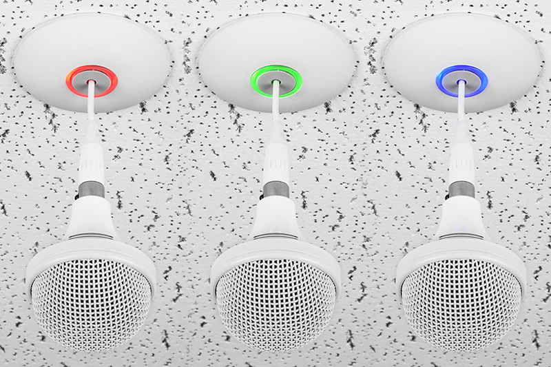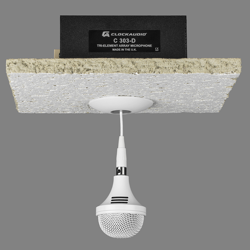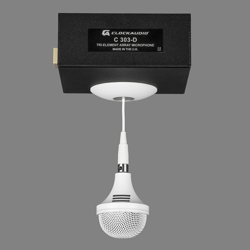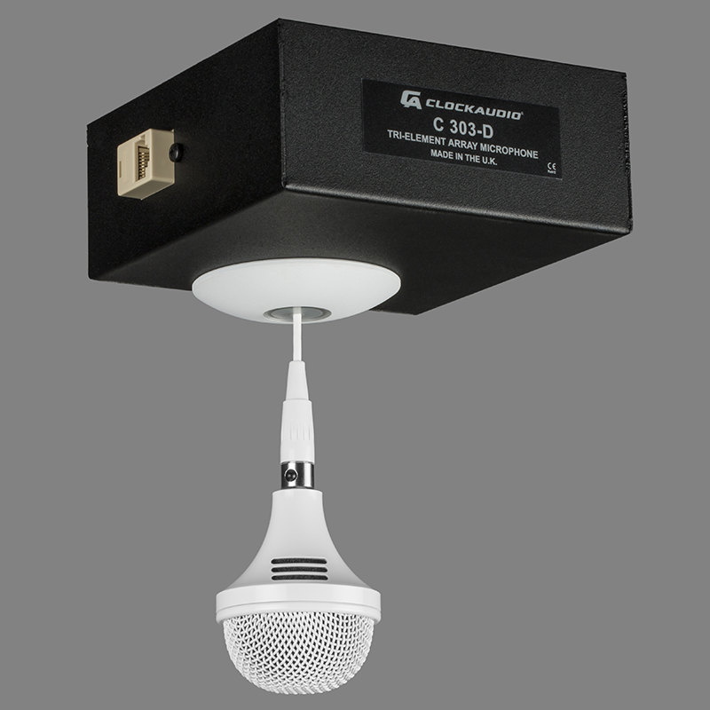 Clockaudio C 303-D – это трехэлементный микрофонный массив с поддержкой Dante, AES67 и питанием по POE. Модель C 303-D также получила возможность управлять программируемым светодиодным RGB кольцом, поставляемым в комплекте с микрофоном.